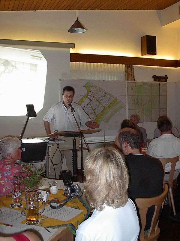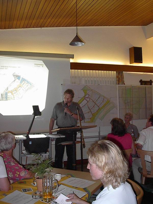 Zur Städtebaulichen Planung äußert sich Herr Gebhard, Bezirksplaner für den Bezirk Vaihingen im Stadtplanungsamt Stuttgart. Er erläutert die Entstehung des Bebauungsplans. Nach einem städtebaulichen Wettbewerb muß der gewählte Plan in die Rechtsform umgesetzt werden, dabei sind maßgebend das Baugesetzbuch(BauGB), die Baunutzungsverordnung (BauNVO) und die Landesbauordnung Baden-Württemberg (LBO). Beteiligt sind die städtischen Ämter, Träger öffentlicher Belange (z.B. Telekom, NWS) und die Bürger. Beschlossen wird ein Bebauungsplan im Gemeinderat. Auf die Durchführung besteht allerdings kein Rechtsanspruch. Letztendlich bestimmt die Stadt über die Ausführung. Von der Aufstellung des Bebauungsplans bis zum Satzungsbeschluß vergehen im Durchschnitt 2 Jahre, da Anregungen der Bürger aufgenommen werden und gesetzliche sowie verwaltungsinterne Fristen eingehalten werden müssen. Für die Realisierung auf den Gemeinbedarfsflächen wie Schulen, Kinder- und Jugendeinrichtungen, Stätten für Kultur Gesundheit und Kirche sind verschiedene Ämter der Stadt verantwortlich. Öffentliche Grünflächen wie Spiel- und Sportplätze Parks und Lärmschutzwall gehören nicht zu den Gemeinbedarfsflächen. Für die Nutzung der Privatflächen sind Wohnbaugesellschaften und andere Privatpersonen verantwortlich.