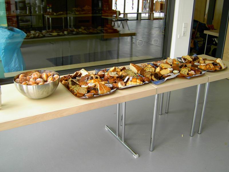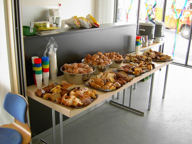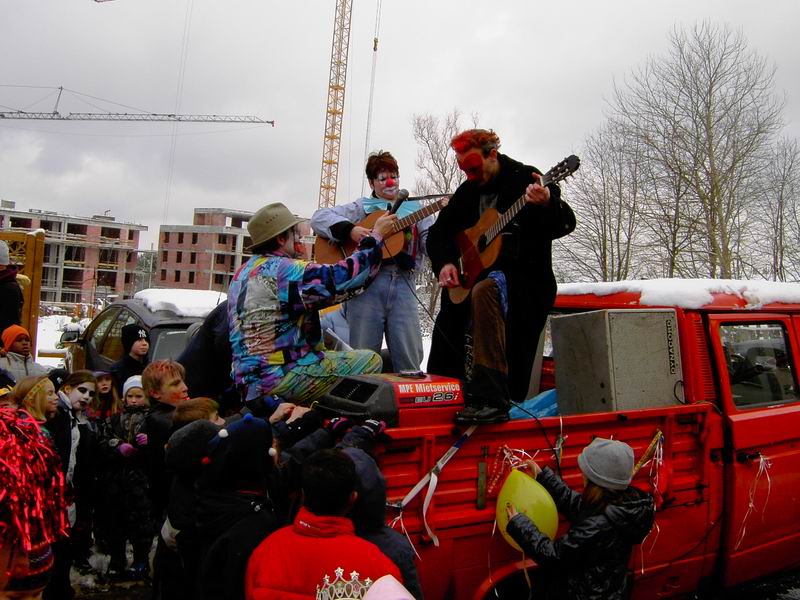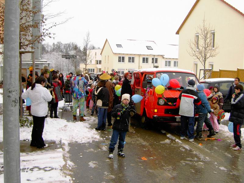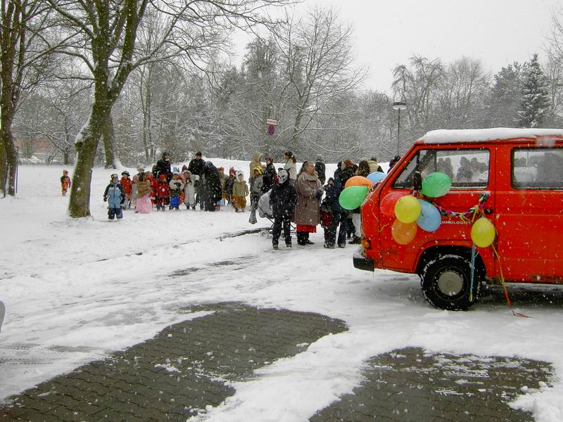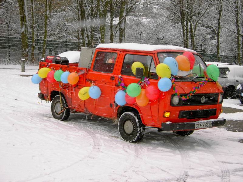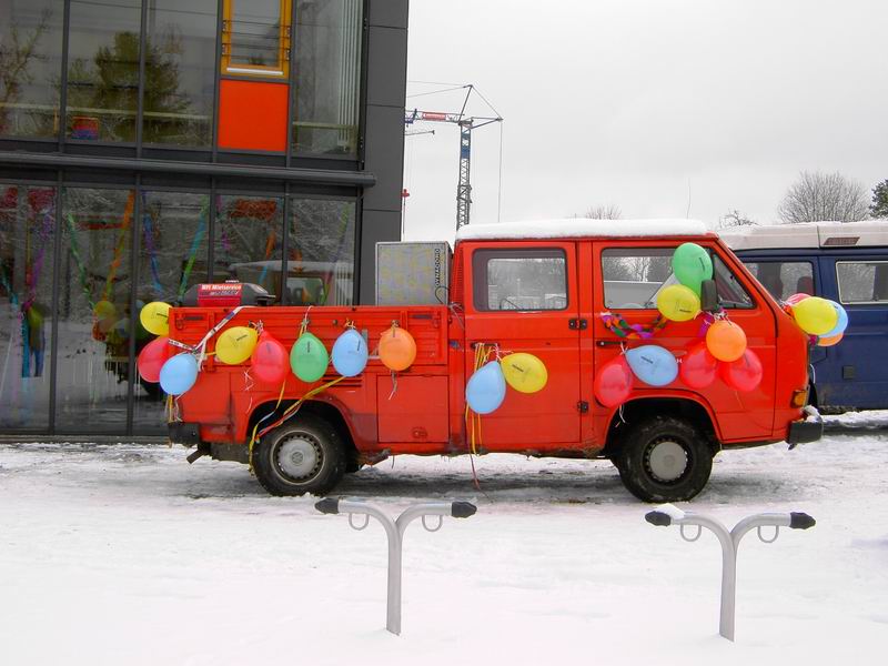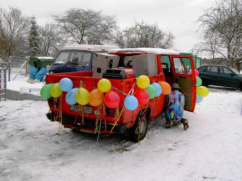 ... den Fasching geschmückt. Es wurden gigantische Mengen ...  ... Kuchen und Krapfen gespendet! Vielen Dank noch mal an alle fleißigen SpenderInnen! Auf dem Parkplatz beim Spielberg wartet der einzige Umzugswagen ...