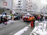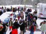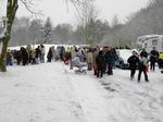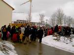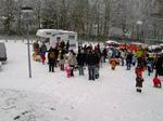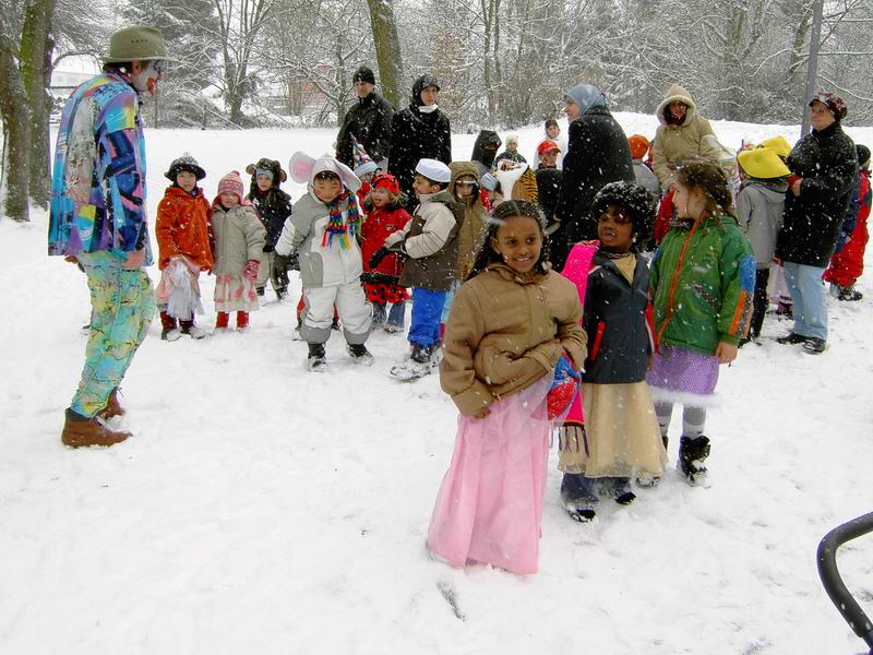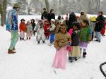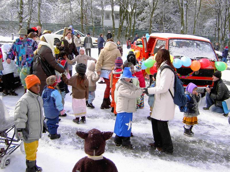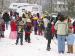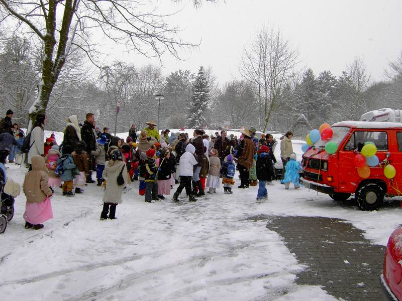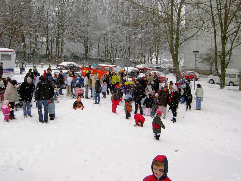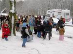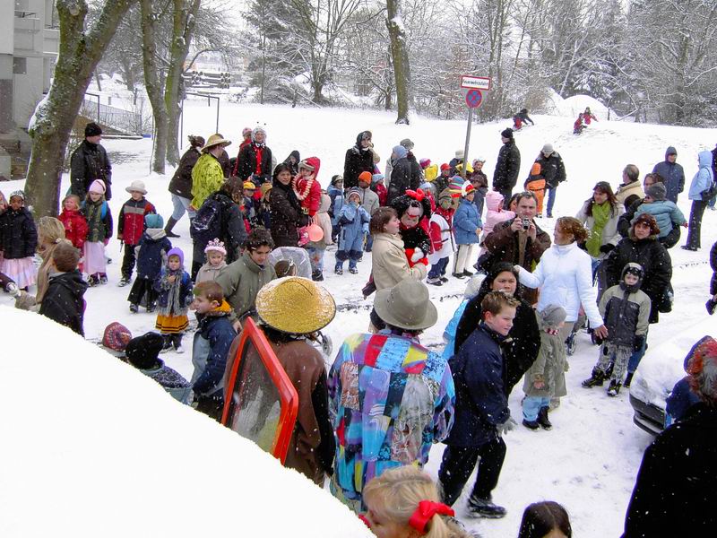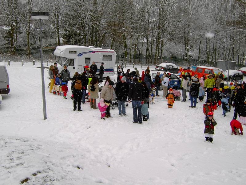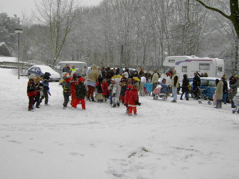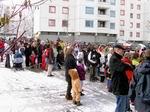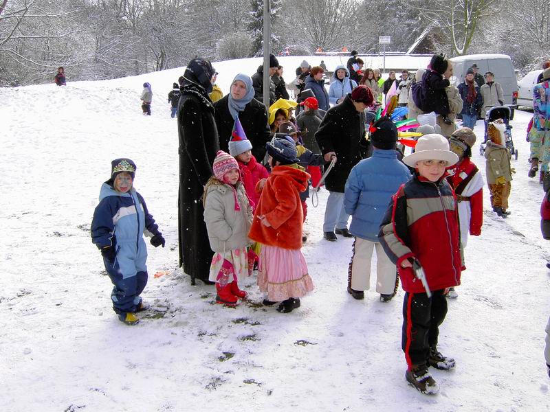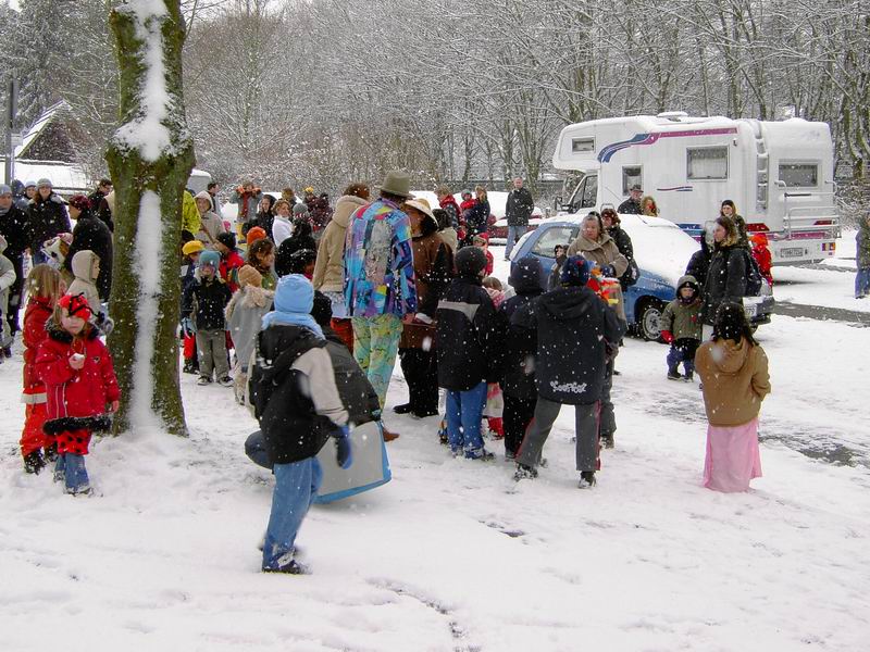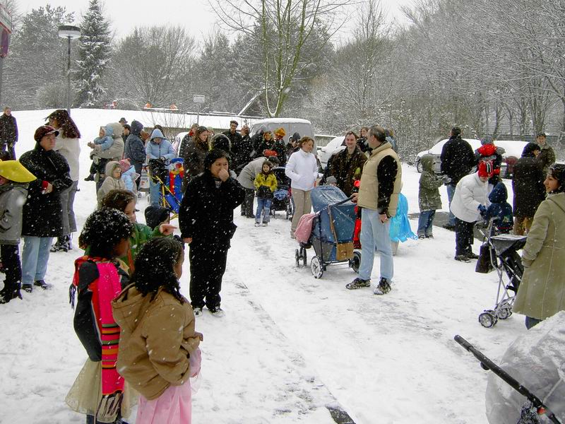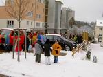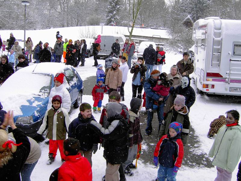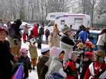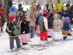 Es kommen auch immer noch Kinder mit ihren Eltern dazu ... ... und reihen sich bei den wartenden Narren ein.  Und dann kommt doch noch die Sonne raus und es hört auf zu schneien.