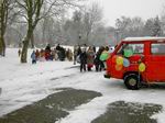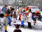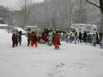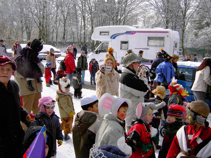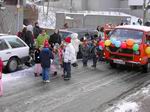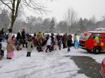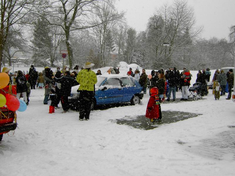 ... auf das Eintreffen der ersten Narren. Es fängt an zu schneien, aber ... ... auch die ersten Narren kommen schon kurz nach halb zwei zum Start. Es ist sehr kalt. Aber die Musik vom Wagen regt zum Tanzen und ...