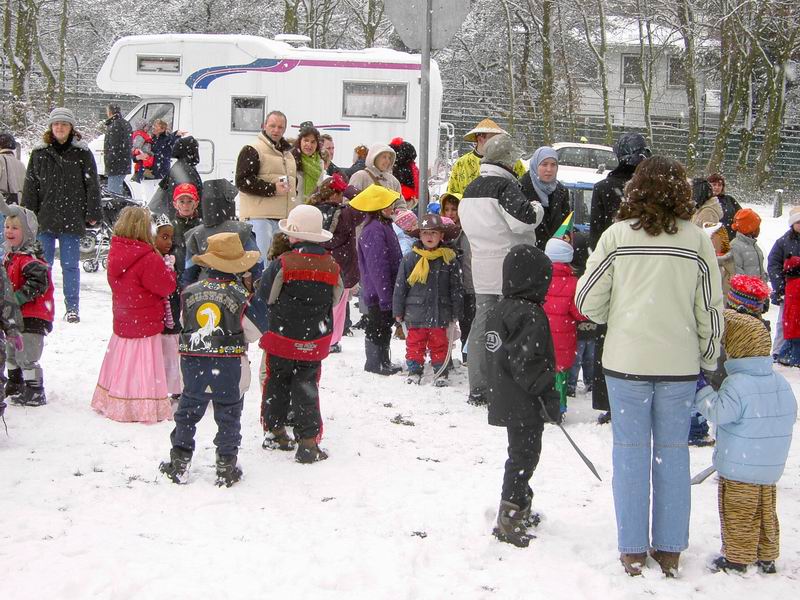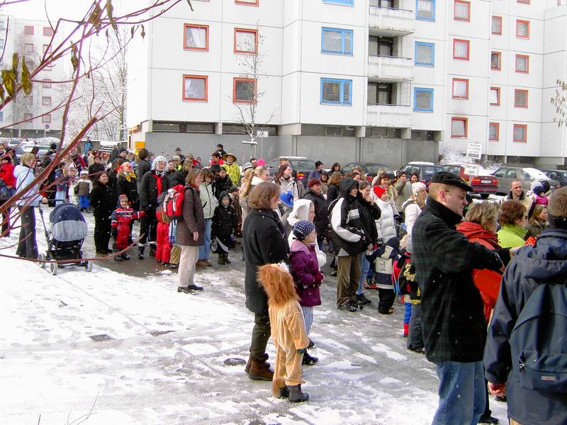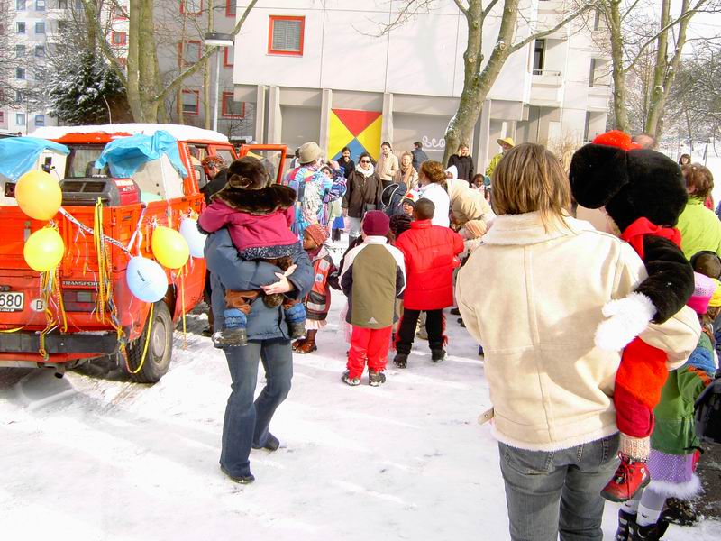 ... Springen an, sodass man der Kälte trotzen kann. Klaus Kurzweg von der Gemeinwesenarbeit animiert die Kinder zum Mittanzen.  Und so langsam werden es immer mehr Narren und sonstige Pappnasen.