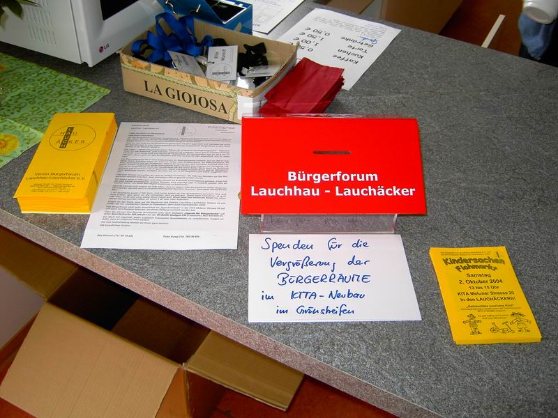 Am 6. März 2004 veranstaltete das Bürgerforum Lauchhau-Lauchäcker e.V. mit der KITA in der Meluner Straße 20 den zweiten KINDERSACHENBAZAR in den Lauchäckern. 21 Tische konnten vermietet werden. Der Besuch und der Verkauf war diesmal sehr rege. Die Presse hatte unsere Anzeigen gut plaziert. In den Wochen vor dem bazar hatten wir 880 DIN-A6-Flyer überall in Vaihingen und in den KITAs verteilt und 450 DIN-A4-Aushänge aufgehängt. Es wurden wieder sehr viele sehr gute Kuchen gespendet.