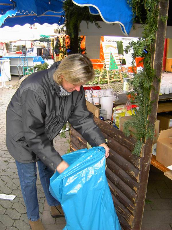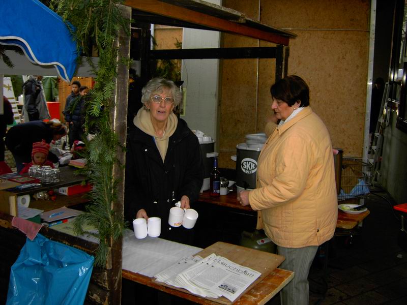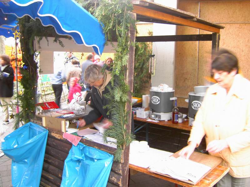 Geschirr zum Spülmobil bringen - Töpfe nachfüllen - Kasse führen. Engel und Helfer gönnen sich ein Päus'chen bei einer Tasse Glühwein. Zusätzliche Schilder weisen auf unser Angebot hin.