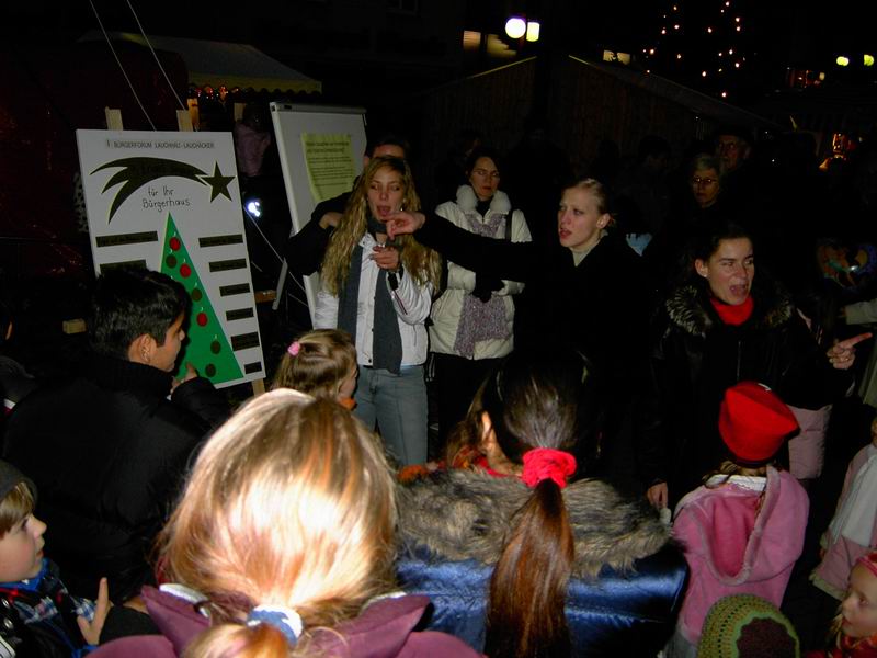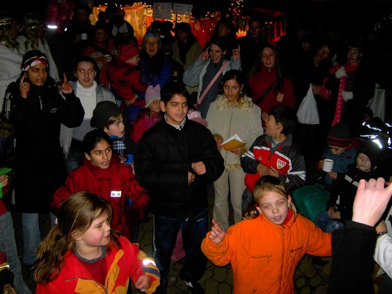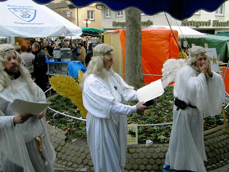 ... Vaihinger Rathausplatz schallen. Wenn auch beim einen das Textheft auseinanderfällt ... ... und die anderen kritisch den rechten Ton suchen, so kommen die Engelsgesänge ... ... doch schnell wieder in die Gänge. Ein ums andere Weihnachtslied bringen Euro für Euro an Spenden ein.