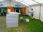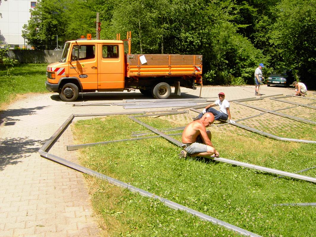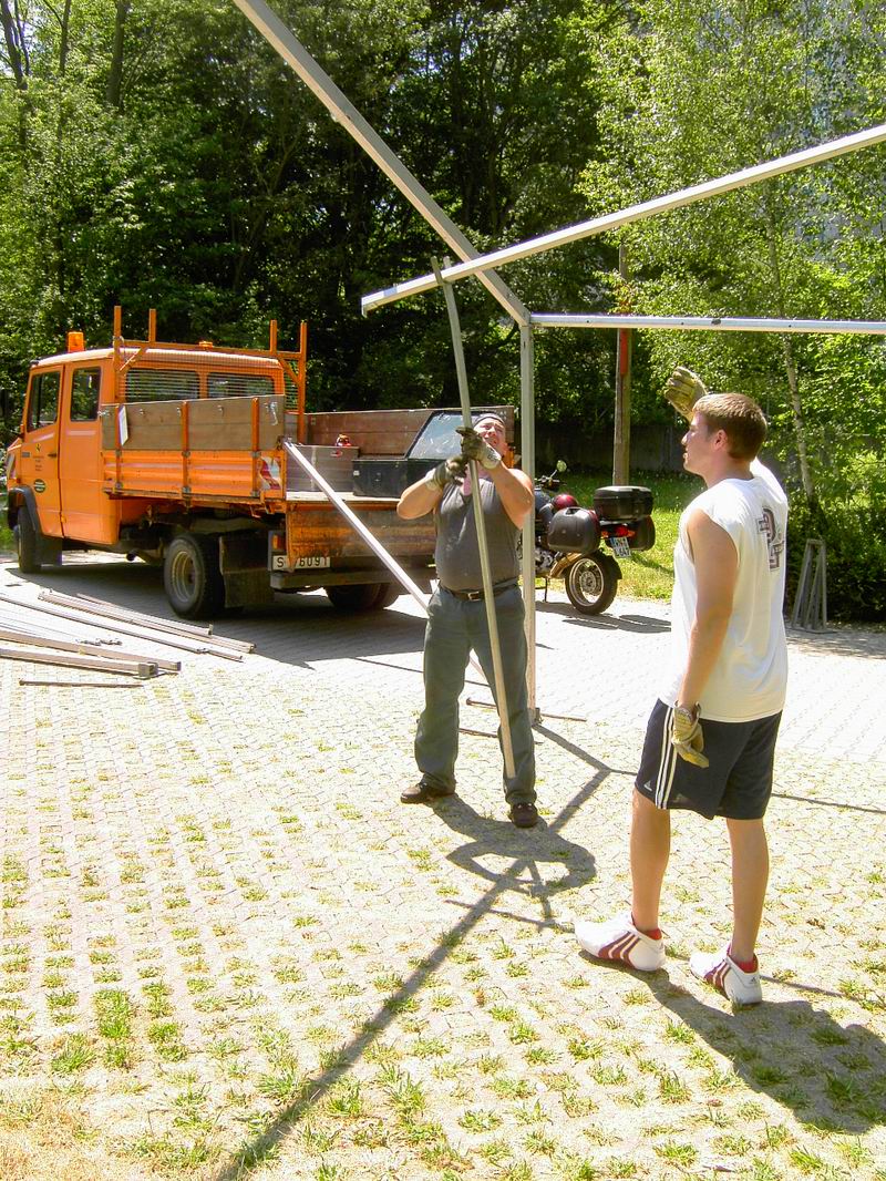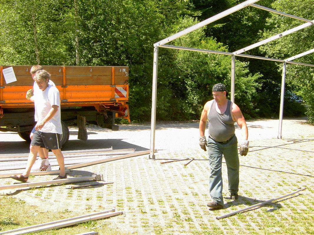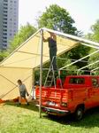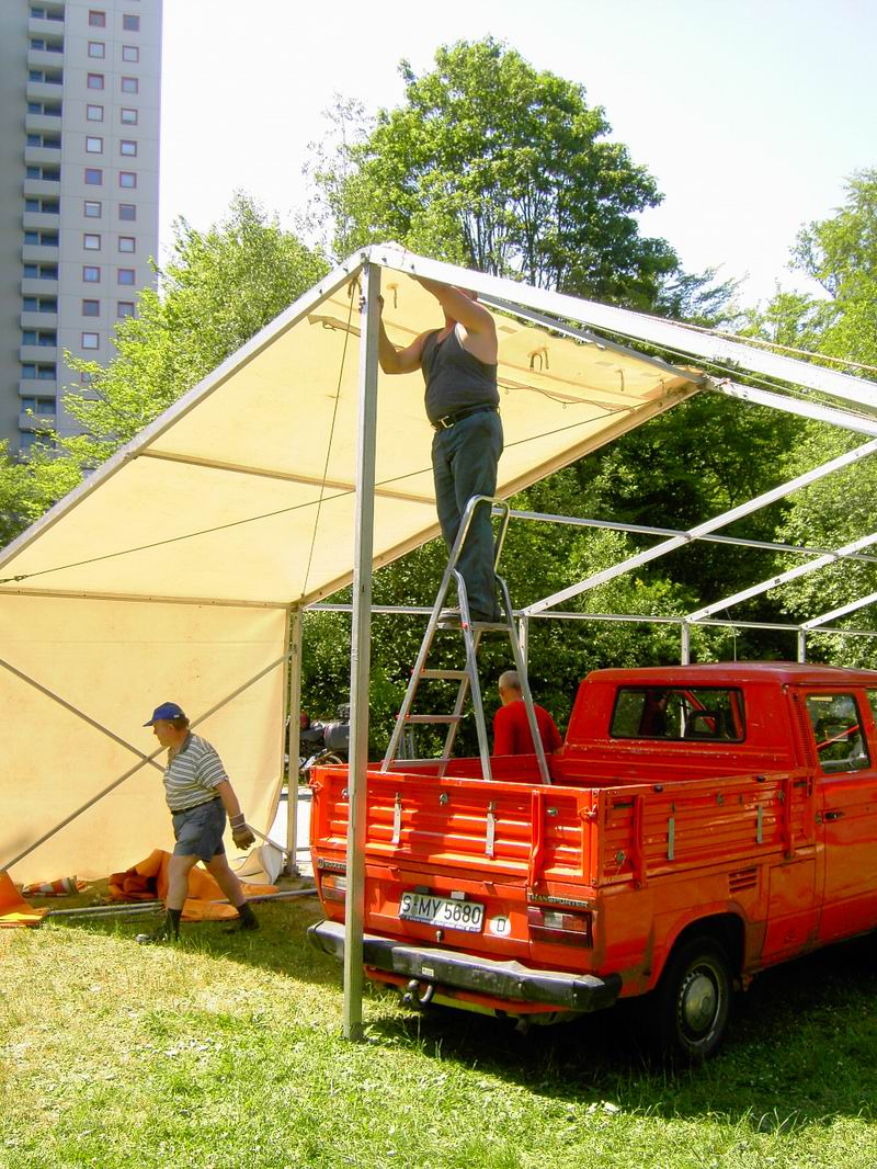 Am Donnerstag früh treffen wir uns am Pavillon zum Abholen des großen Festzeltes des Stadtjugendring an dessen Lagerhalle in der Nähe des Pragsattel in Stuttgart. Glücklicherweise haben wir einige Helfer von der IBC (International Baptist Church Stuttgart) sodass das Aufladen des nachher 8 x 18 Meter großen Festzeltes zügig vonstatten geht (Leider kam ich beim Aufladen nicht zum fotografieren). Schon um 11 Uhr sind wir wieder zurück und können mit dem Aufbau beginnen: