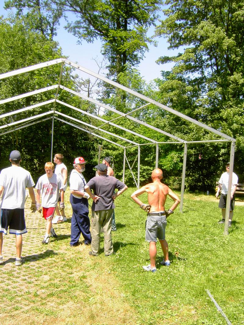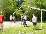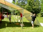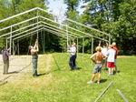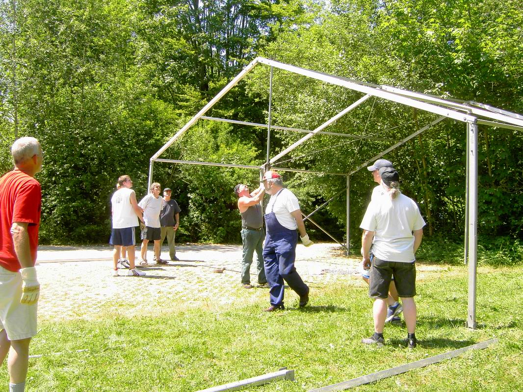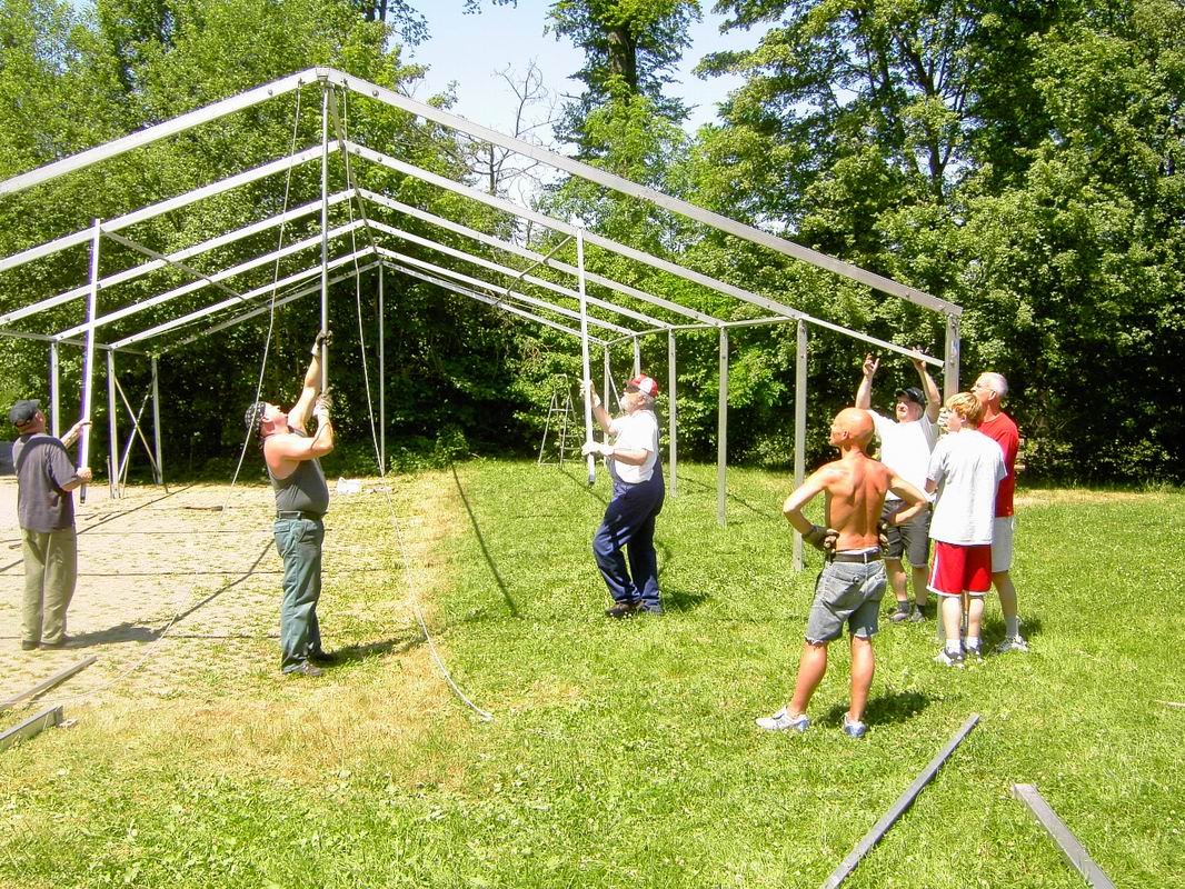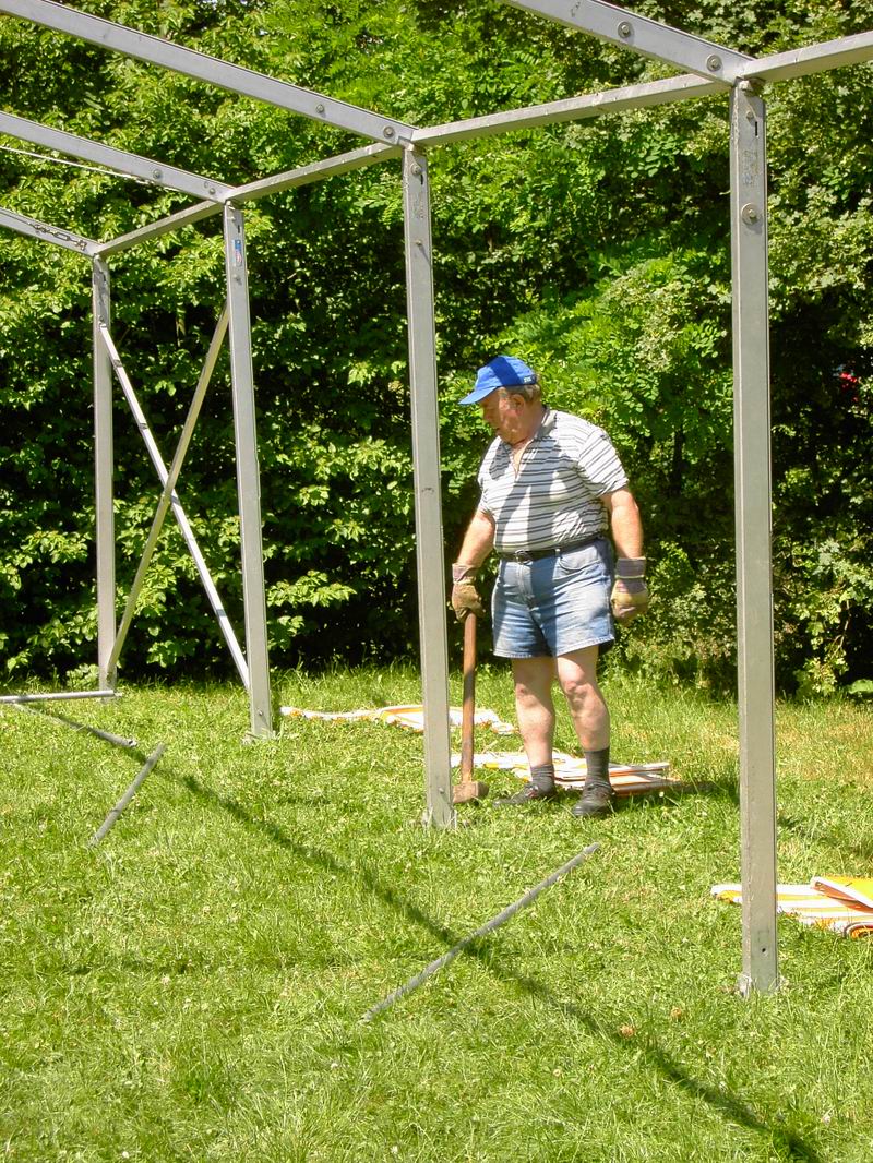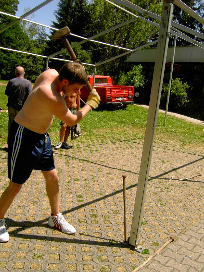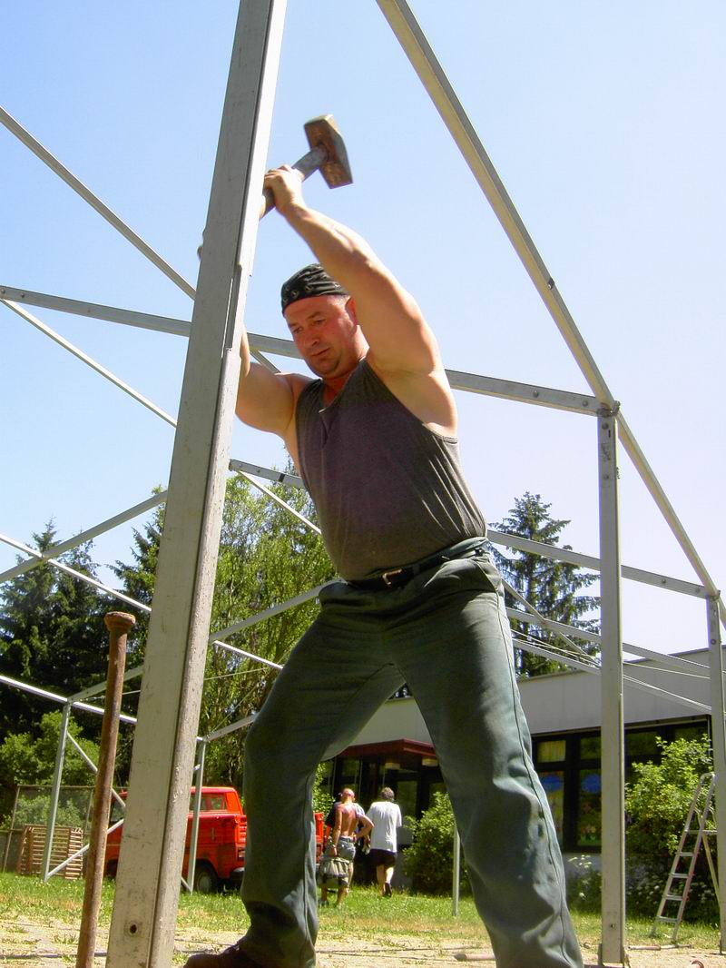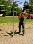 Dazu sollte dann aber auch jeder Schlag sitzen. Gar nicht so einfach! Das erste und letzte Feld des Zeltes werden diagonal verspannt. Auch Hans aus dem Lauchhau haut einige Nägel rein.