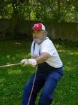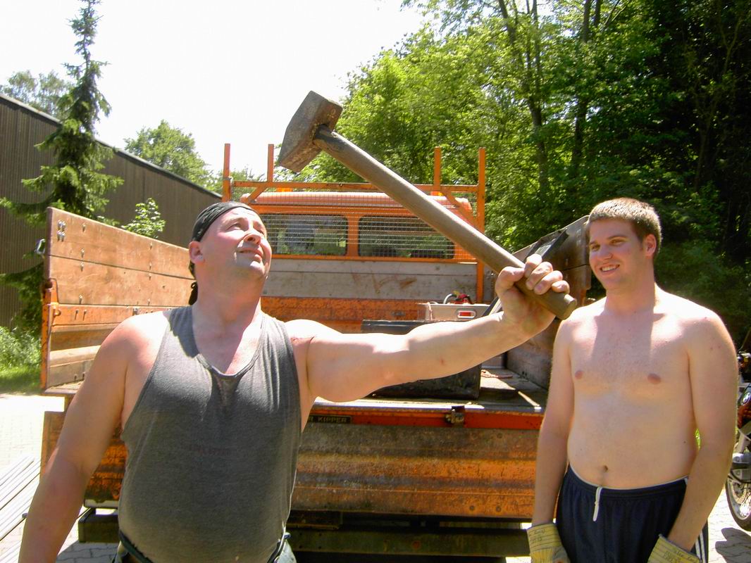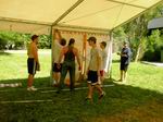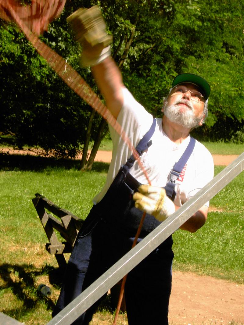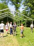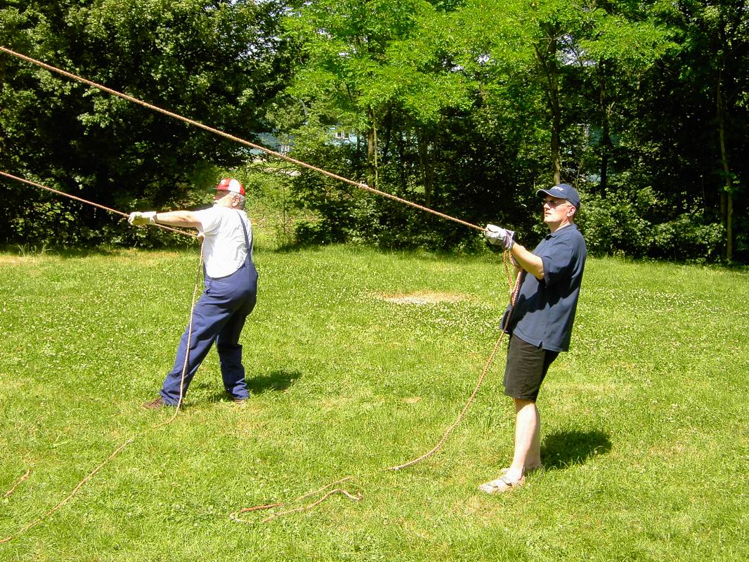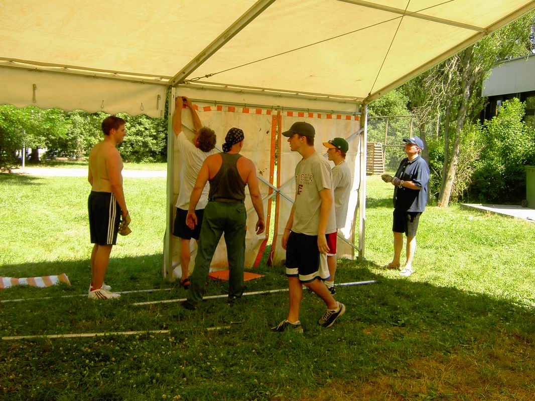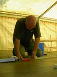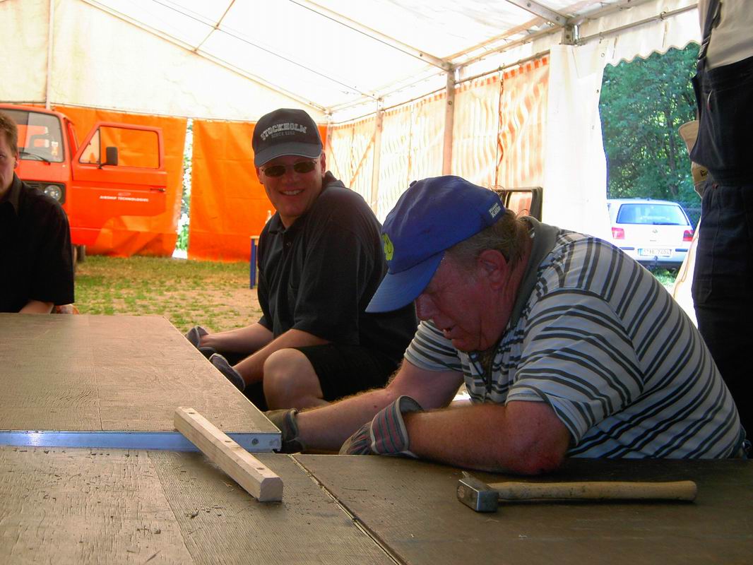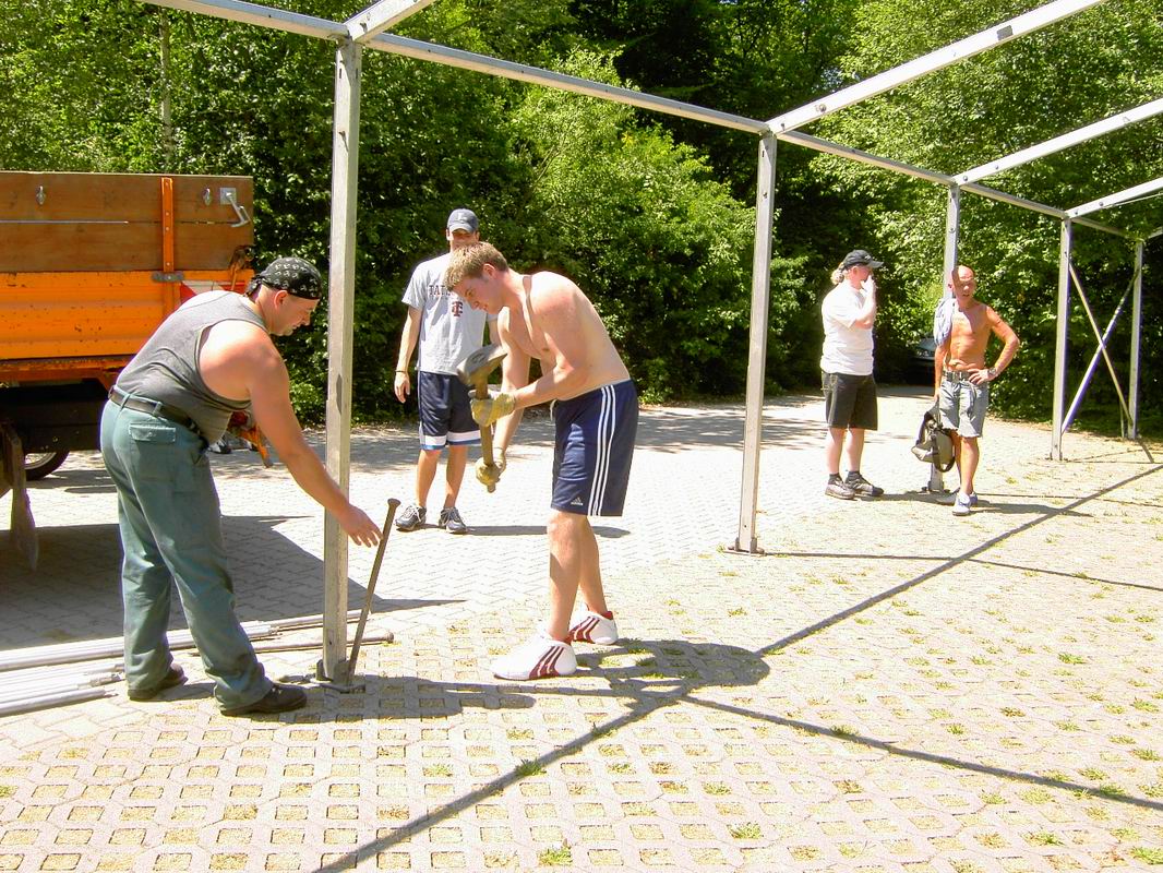 Dazu sollte dann aber auch jeder Schlag sitzen. Gar nicht so einfach! Das erste und letzte Feld des Zeltes werden diagonal verspannt. Auch Hans aus dem Lauchhau haut einige Nägel rein.