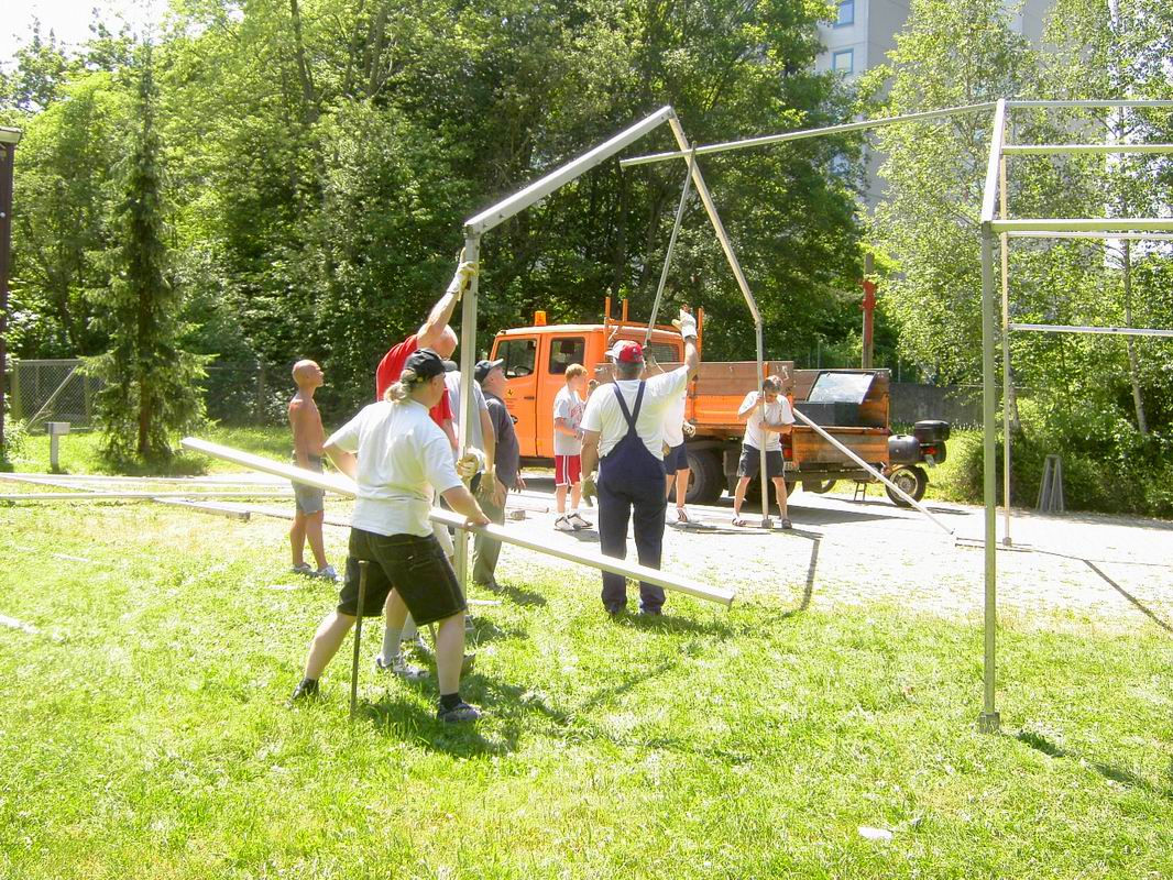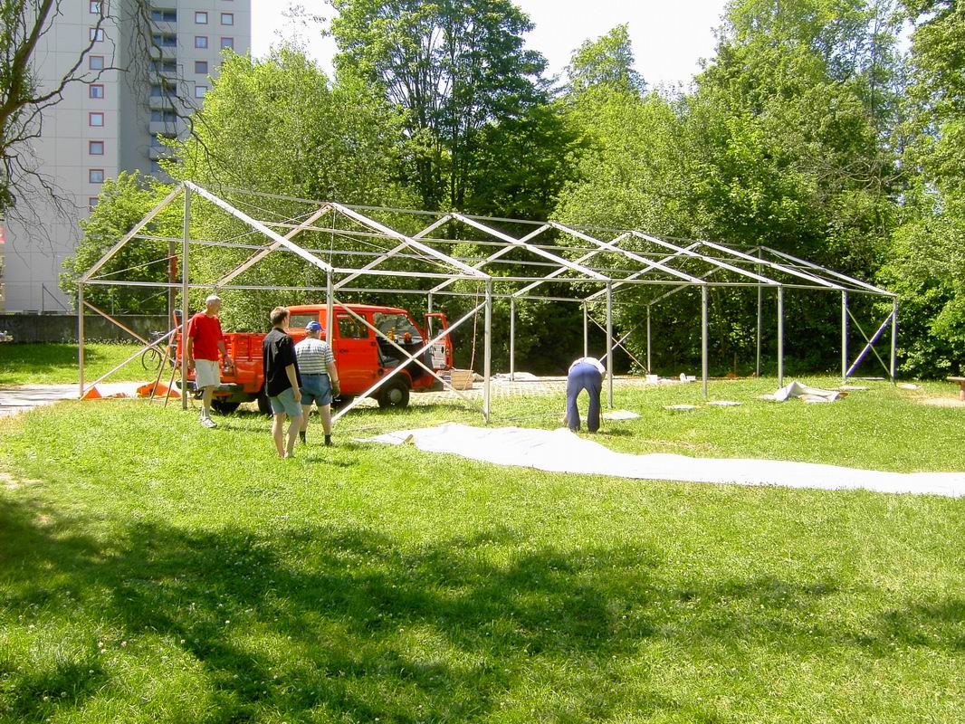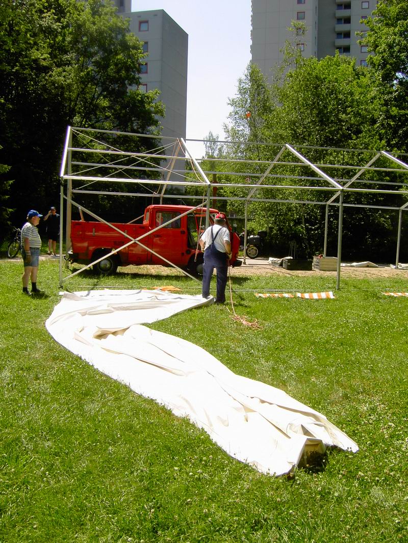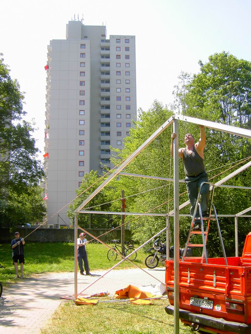 So sieht das ganze Gerüst des Festzeltes aus. Das Hochhaus Sifts- waldstraße 1 im Hintergrund. So, jetzt die Plane von der anderen Seite hochgezogen!