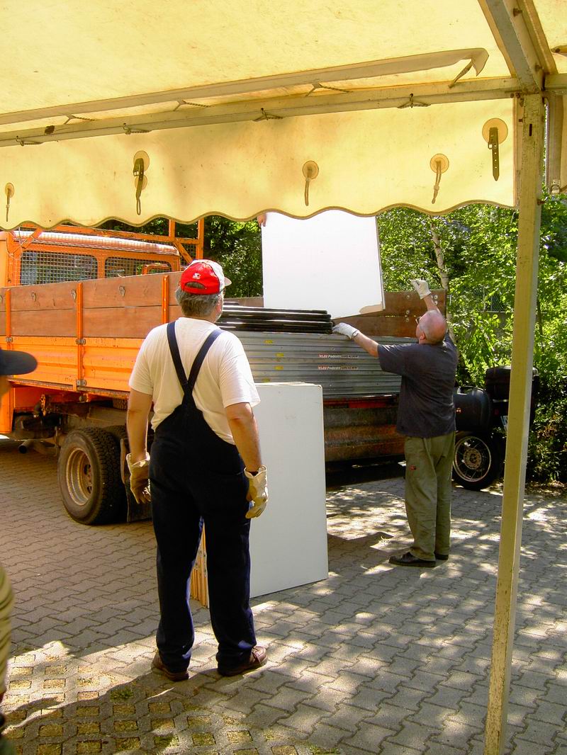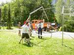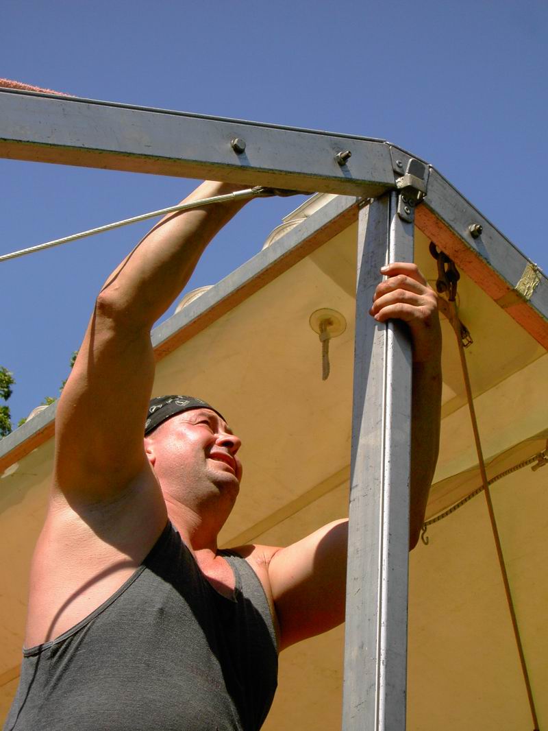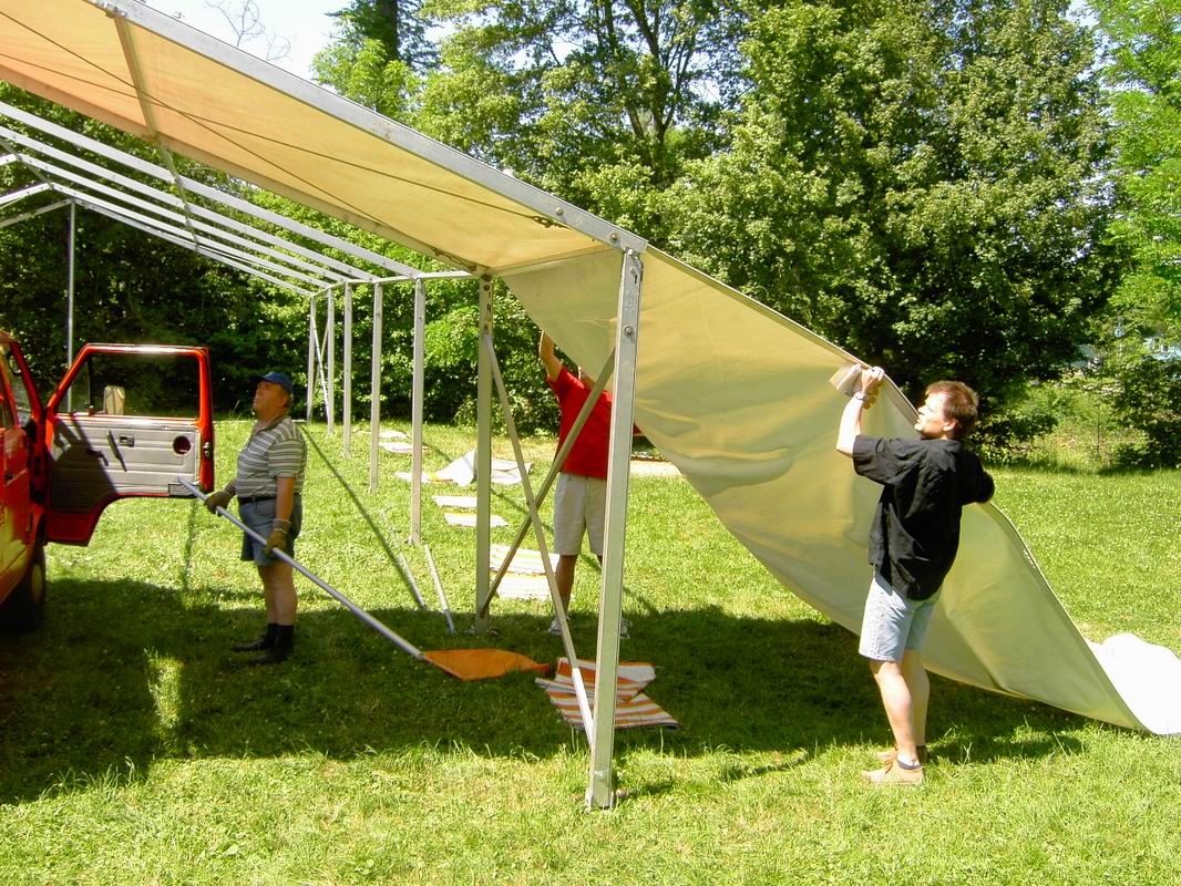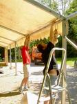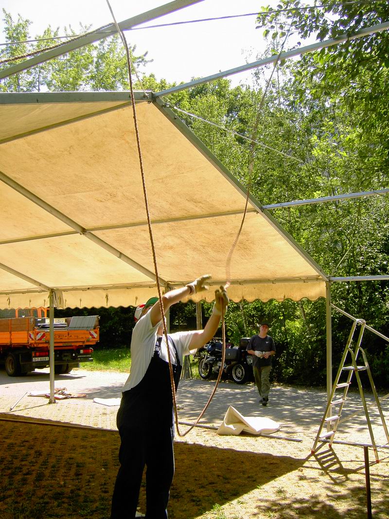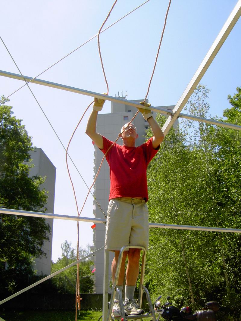 Die Seitenwände werden eingehängt. Frieder am Lasso. A alder Segler ko des au! Ha, jetz had's doch ed ganz nom glangt.