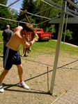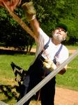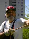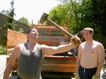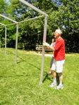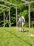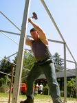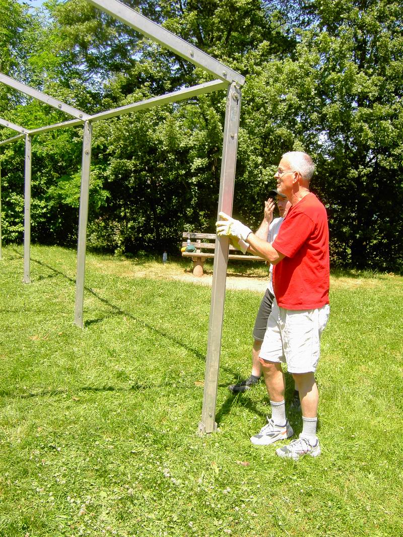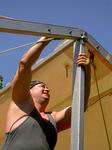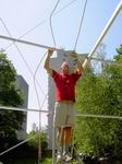 Uwe ist auch wieder dabei uns freut sich, dass es so gut läuft. Die Firststange zum vorletzten Rahmen wird eingehängt. Und jetzt kommt Uwe's große Stunde. Die Erdnägel sind ...