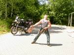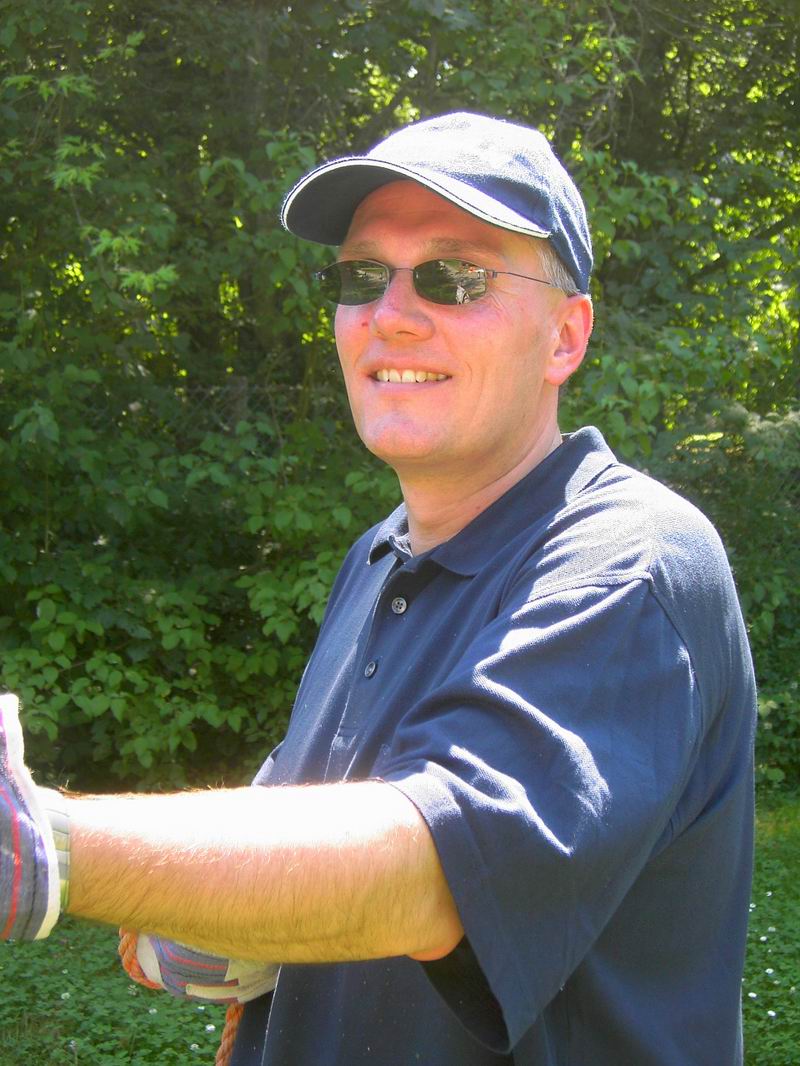 Uwe wirft das Seil für die nächste Dachbahn über den First des Gerüstes. Ja henn ihr's da domma bald gschafft! No hogg e me hald nomml no.