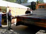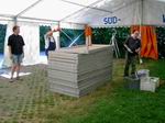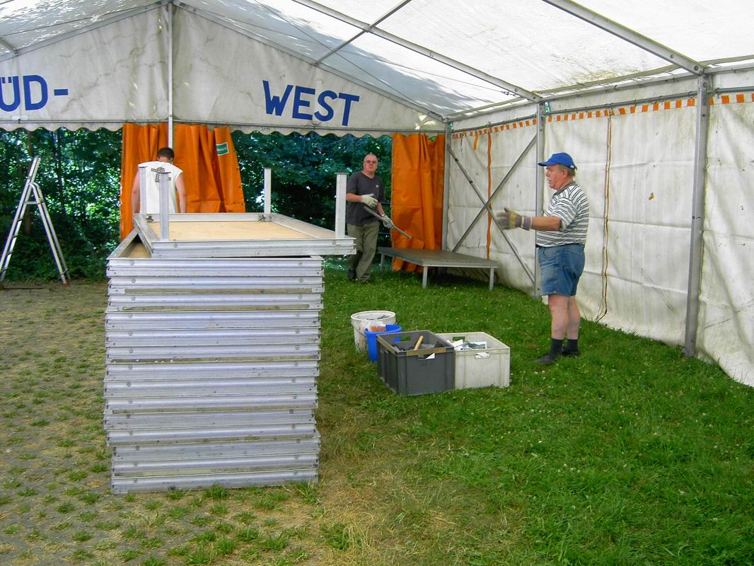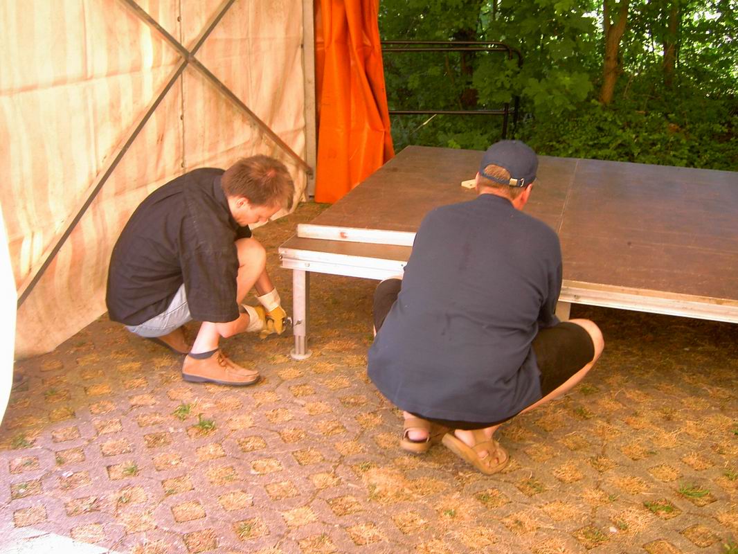 .. wir die Bühne vom Vaihinger Rathaus geholt. Die kostet uns auch ... ... nichts. 4 auf 7 Meter wird die Bühne groß sein. Zuerst müssen die ... ... Füße in die Bühnen- segmente eingesetzt werden.