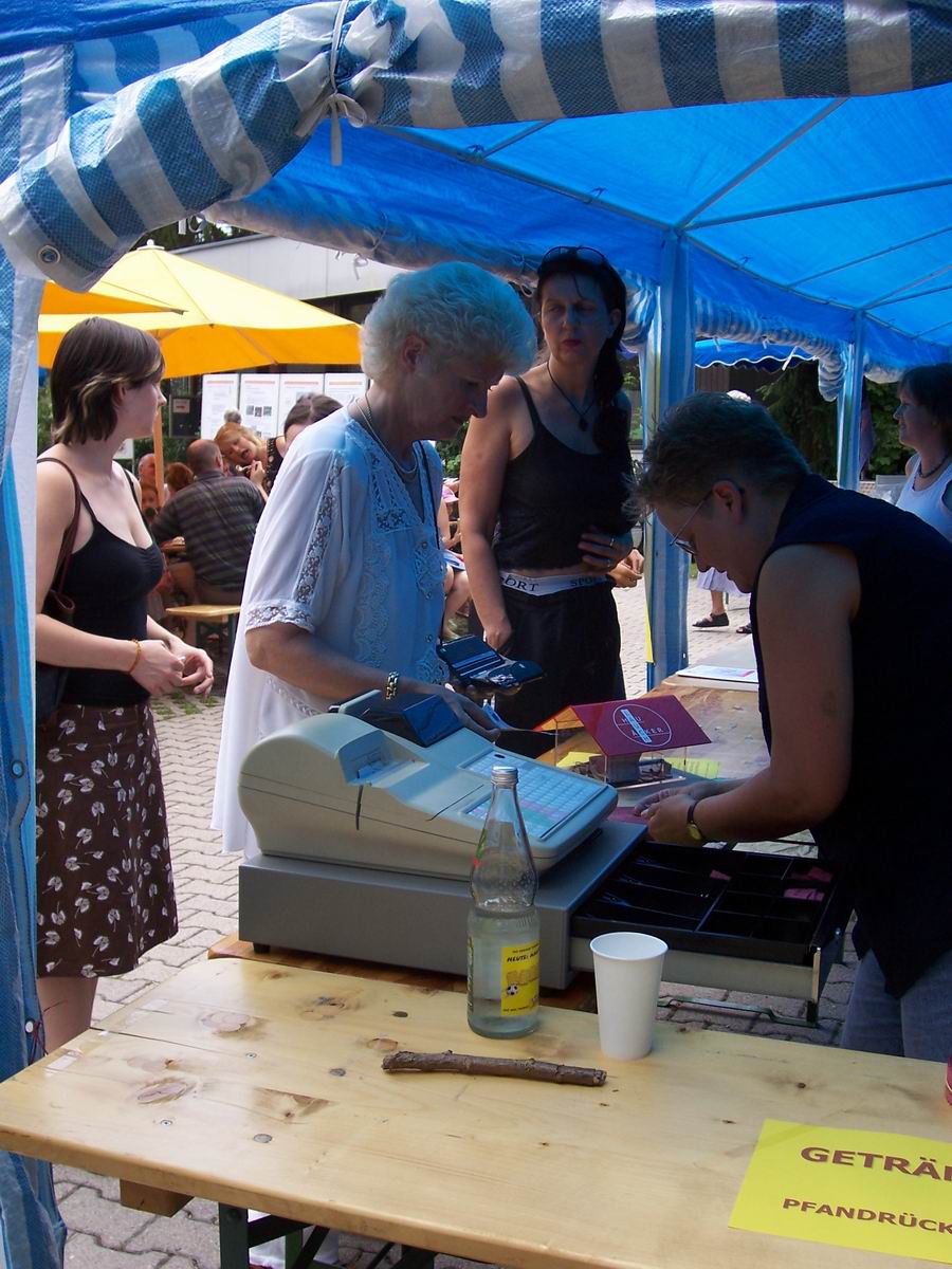 Stadträtin Frau Prof. Dr. Loos kauft Bons. Die Getränketheke Die Kasse