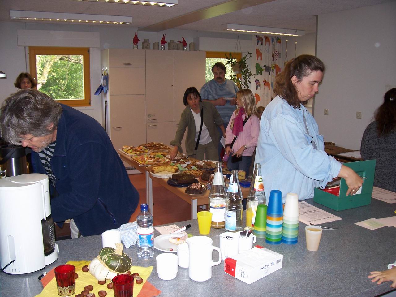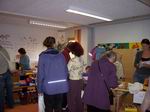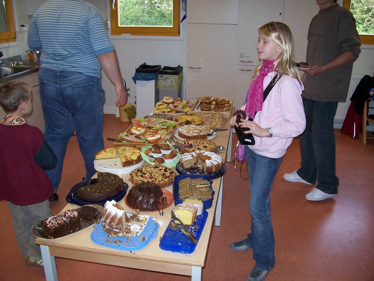 In der Küche gibt es vielerlei Kuchen und Getränke zu kaufen. Vielen Dank für die vielen leckeren Kuchenspenden! Unter der Treppe stehen die sperrigen Sachen.