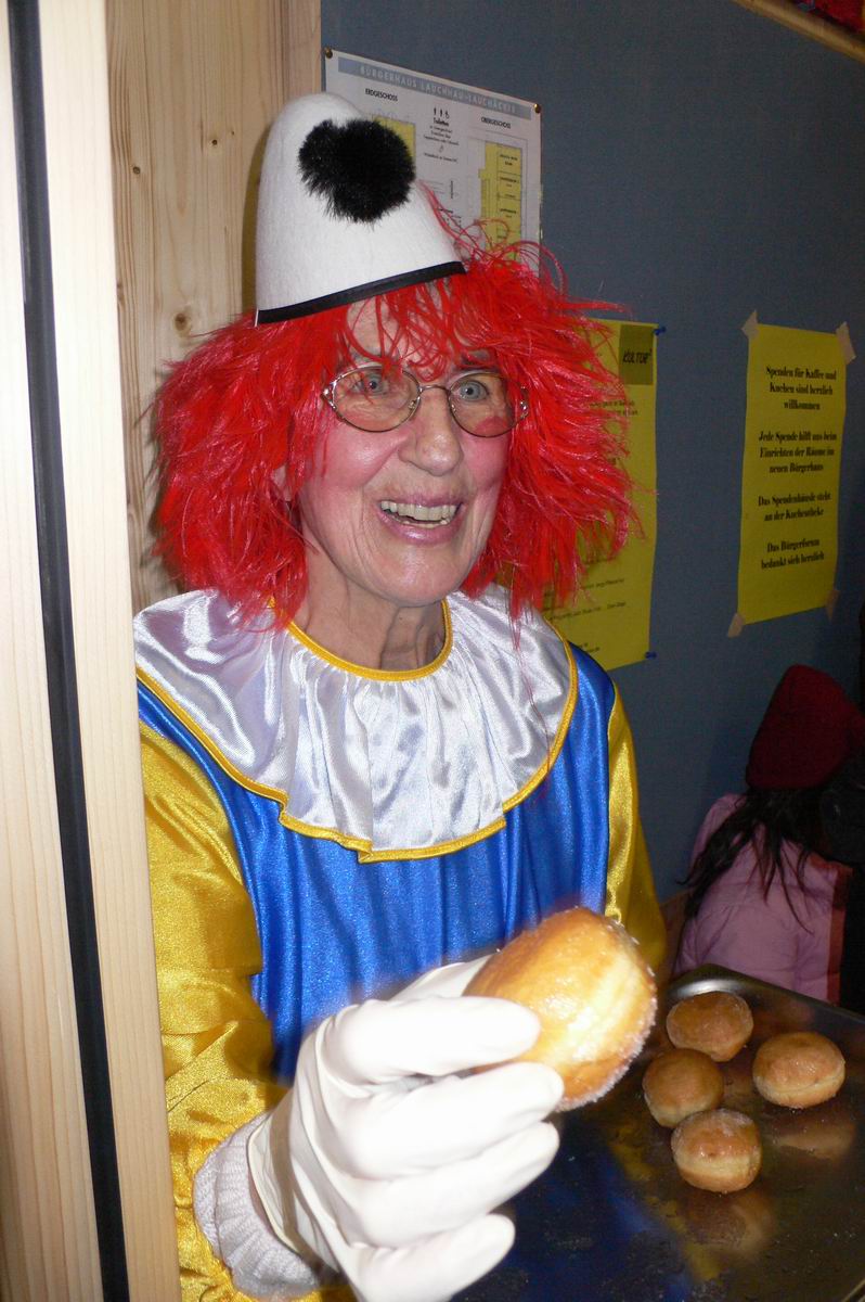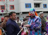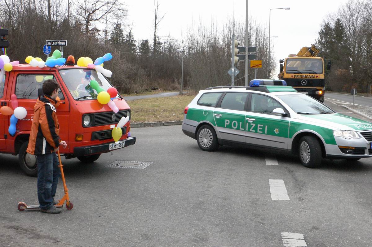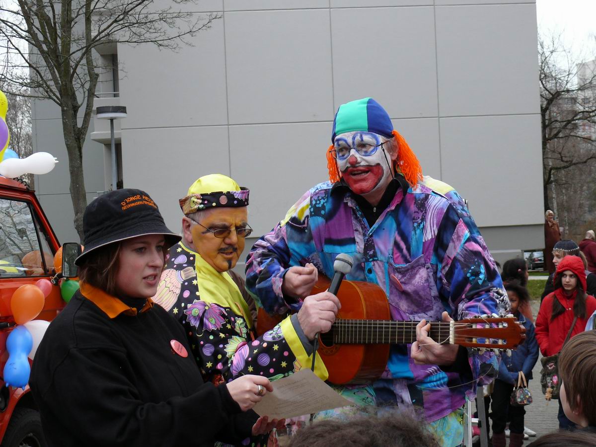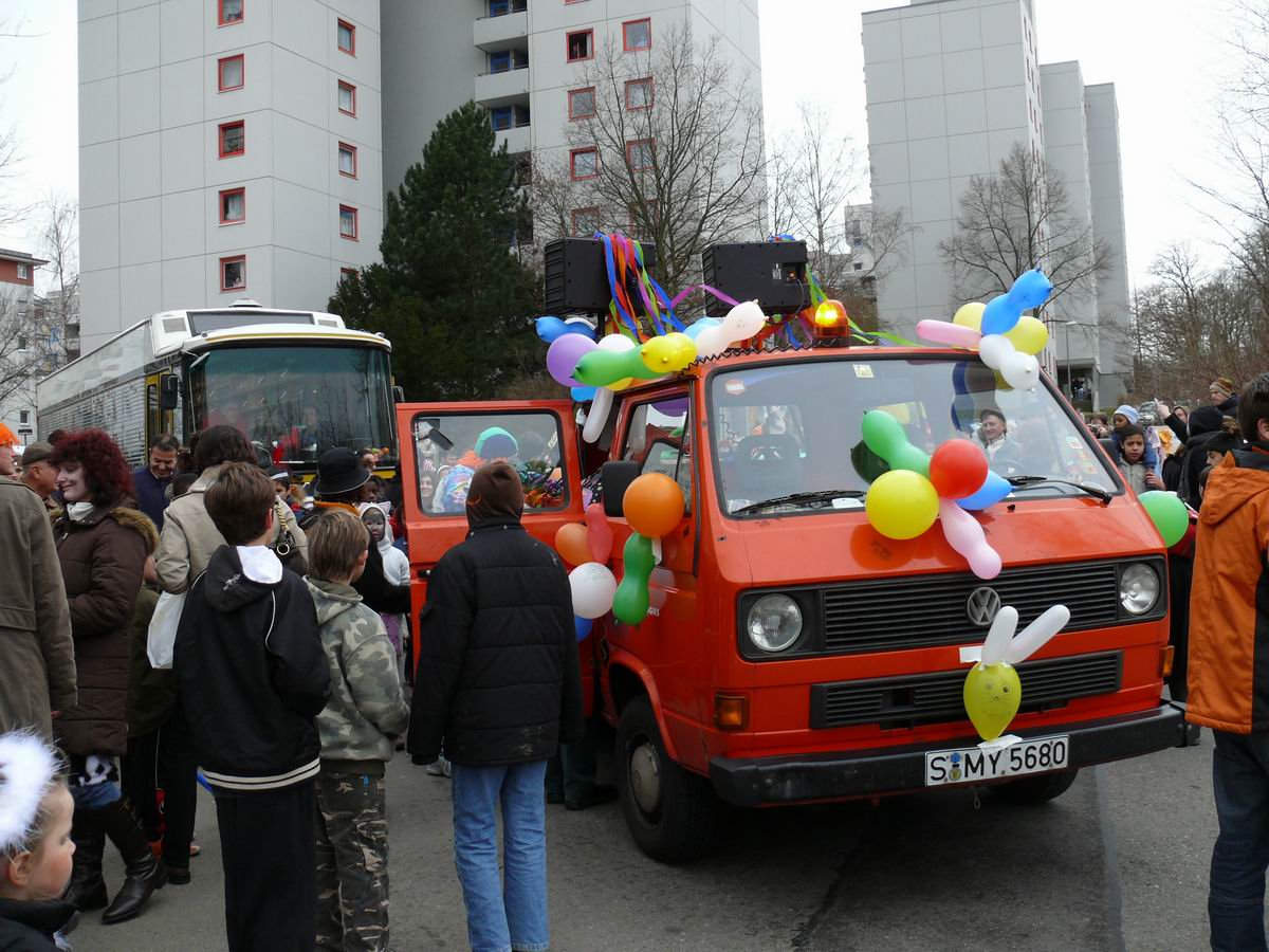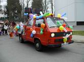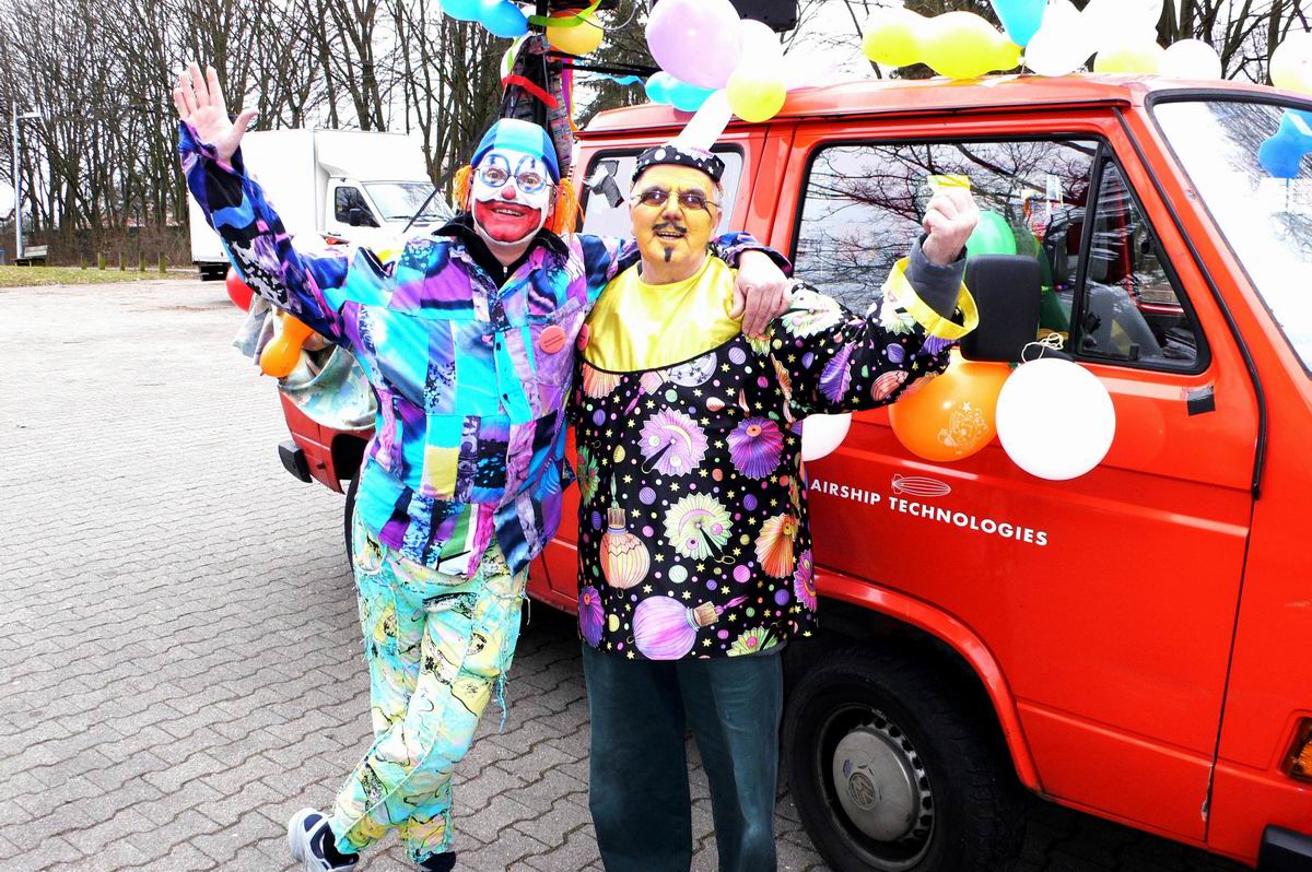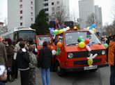 Die beiden Clowns Klaus und Hans haben den BULLY geschmückt und freuen sich auf den Rosenmontagsumzug. Die drei Feen im Kuchenreich: Rita, Frau Schlaich und Rebecca. Auch der "Umzugswagen" der Vaihinger Polizei steht schon bereit, um den Umzug zu sichern.