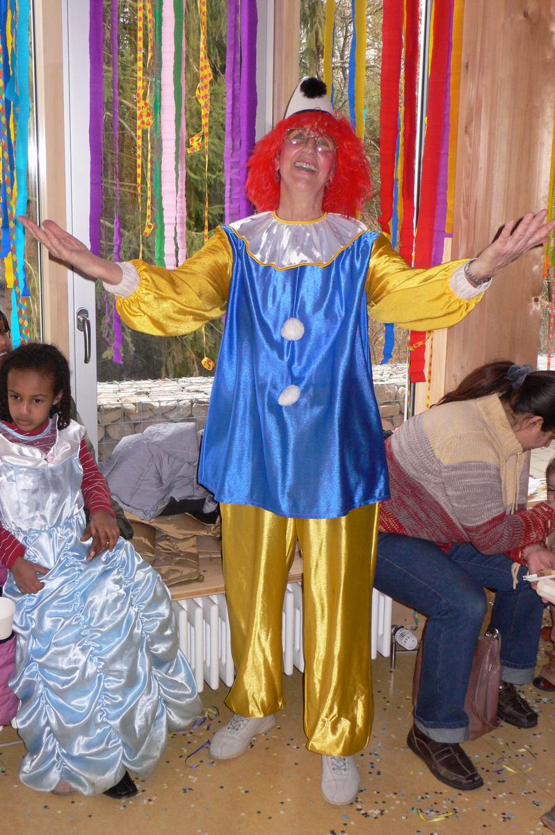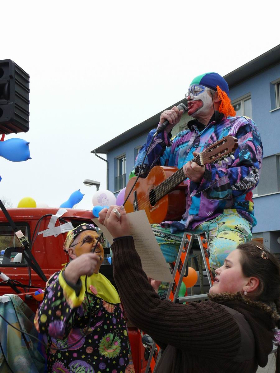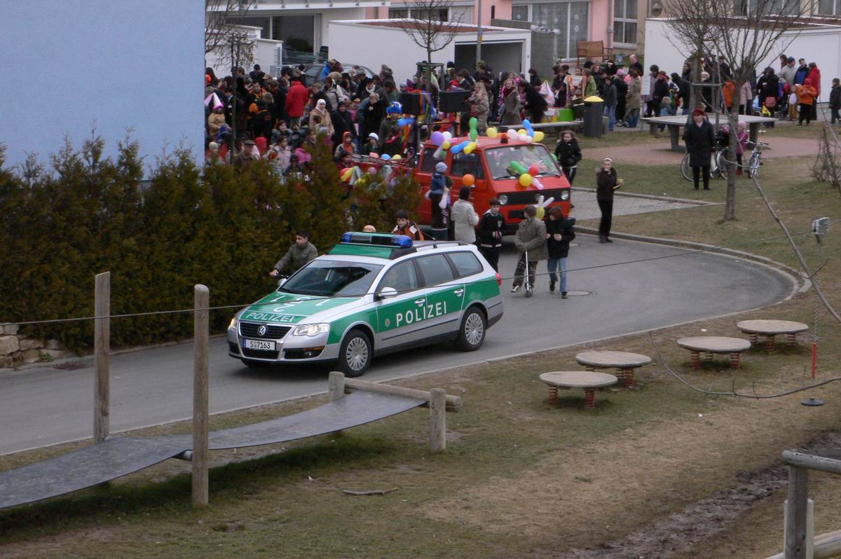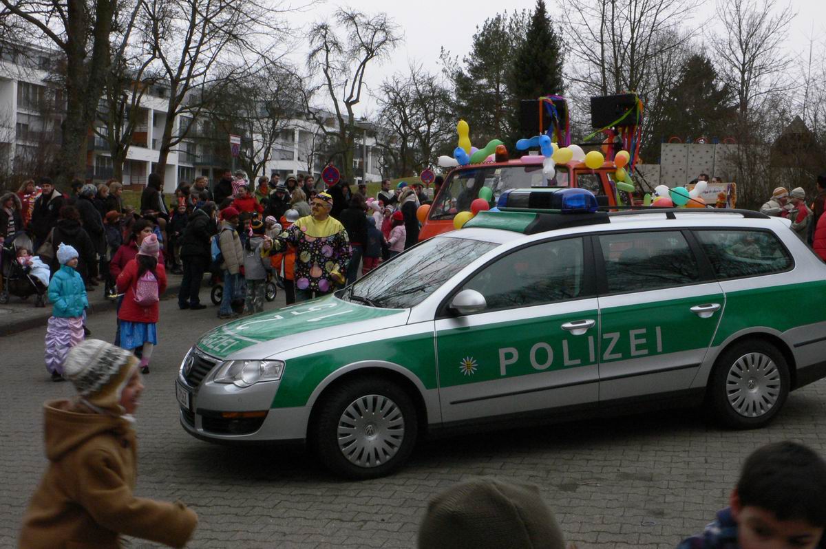 Die beiden Clowns Klaus und Hans haben den BULLY geschmückt und freuen sich auf den Rosenmontagsumzug. Die drei Feen im Kuchenreich: Rita, Frau Schlaich und Rebecca. Auch der "Umzugswagen" der Vaihinger Polizei steht schon bereit, um den Umzug zu sichern.