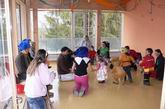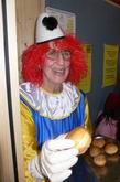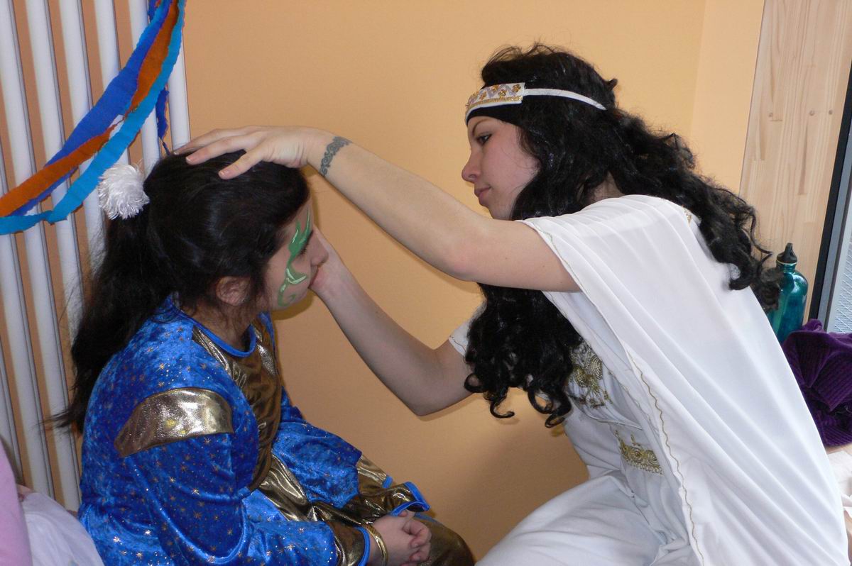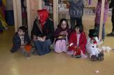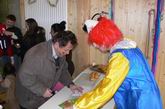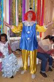 Prinzessinnen und Hexen  lauschen dem Clown am  Mikrofon.