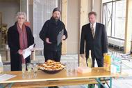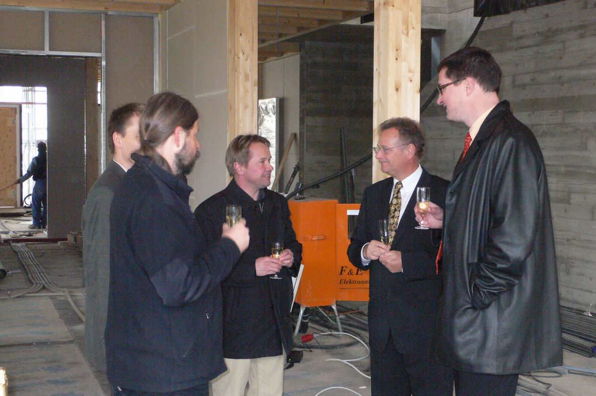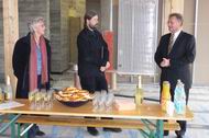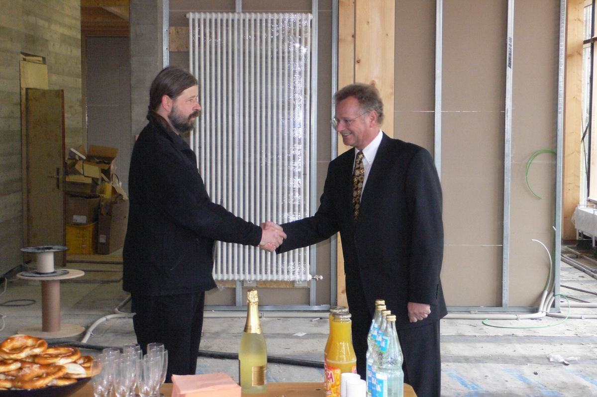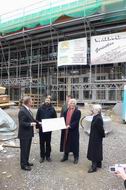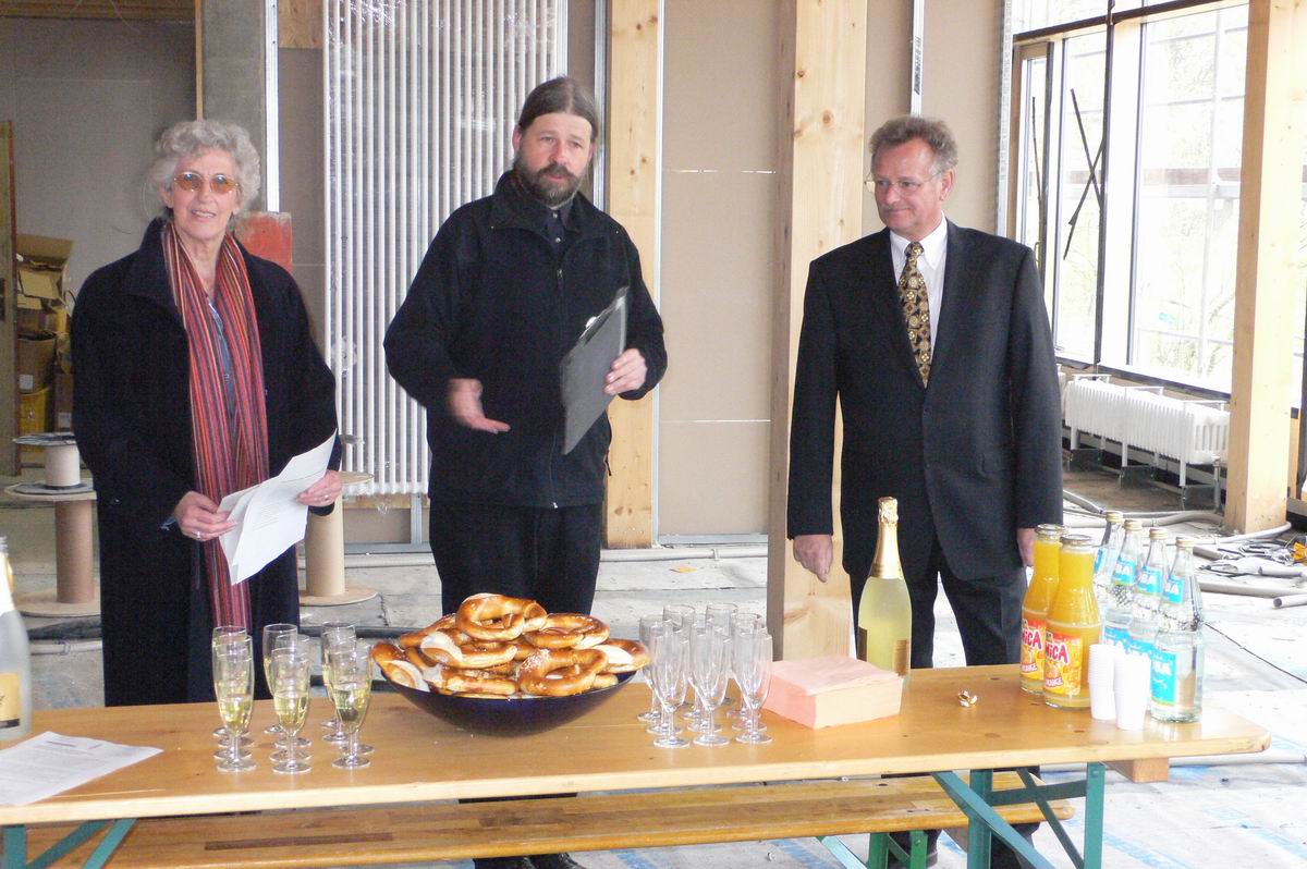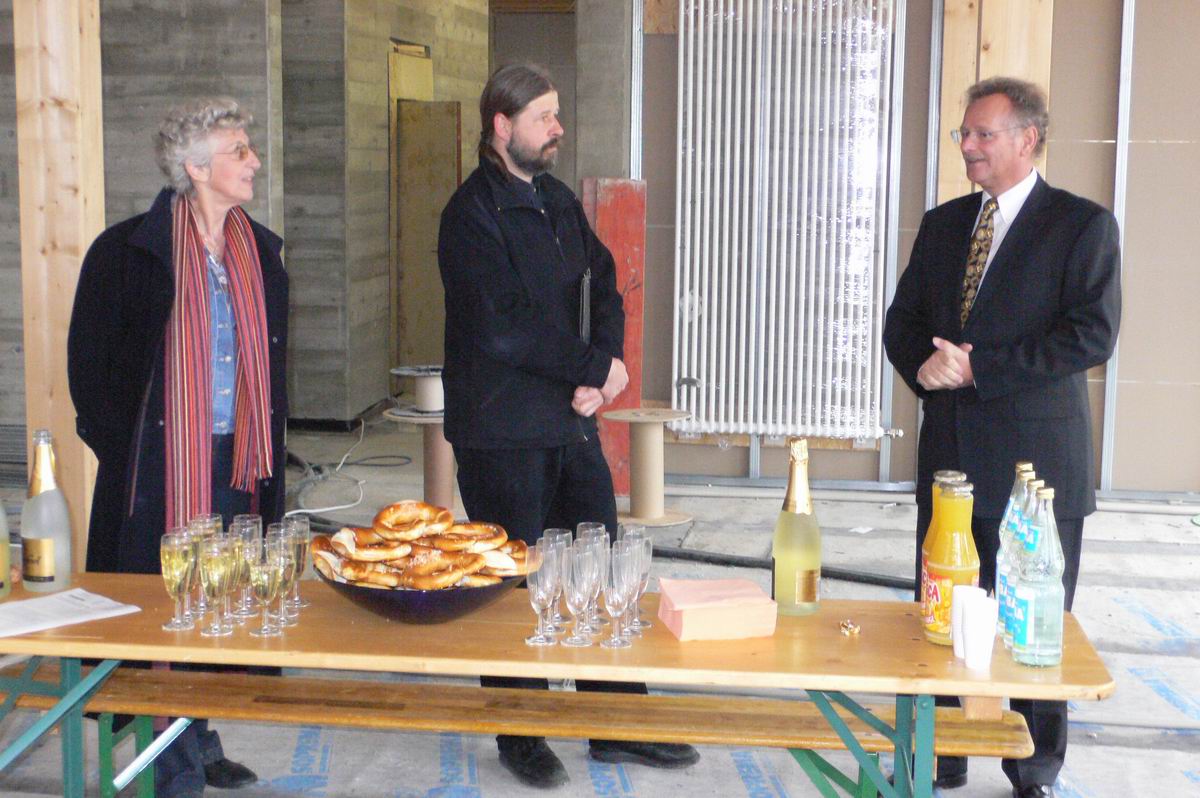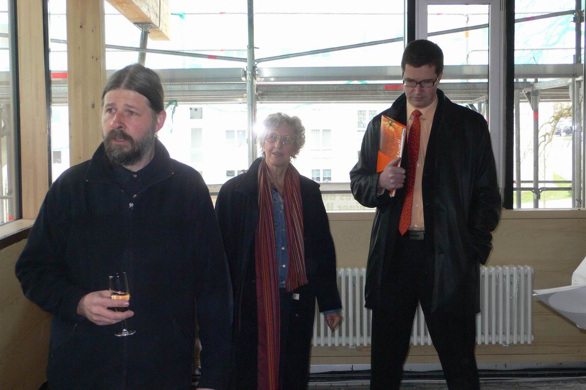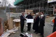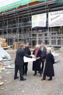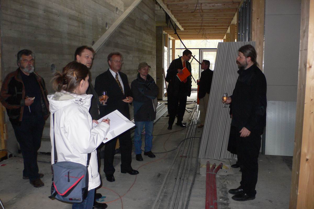 Mit Herrn Scharr und Herrn Lapp warten wir im Rohbau des Bürgerhauses auf das Eintreffen der Pressevertreter.